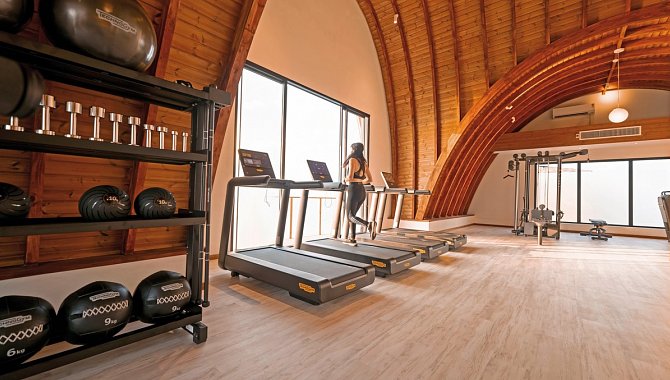 - Fitnessraum und Beach-Volleyball.