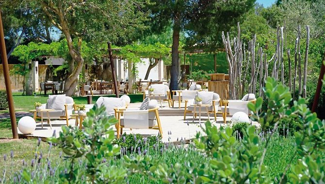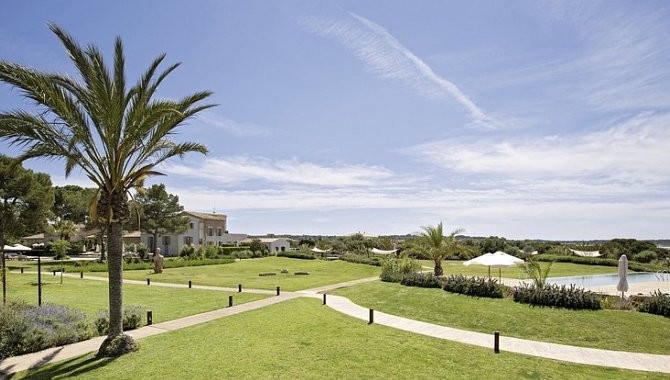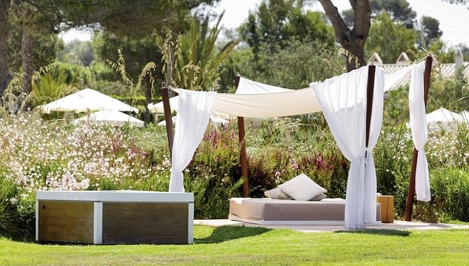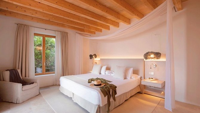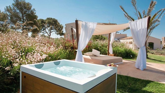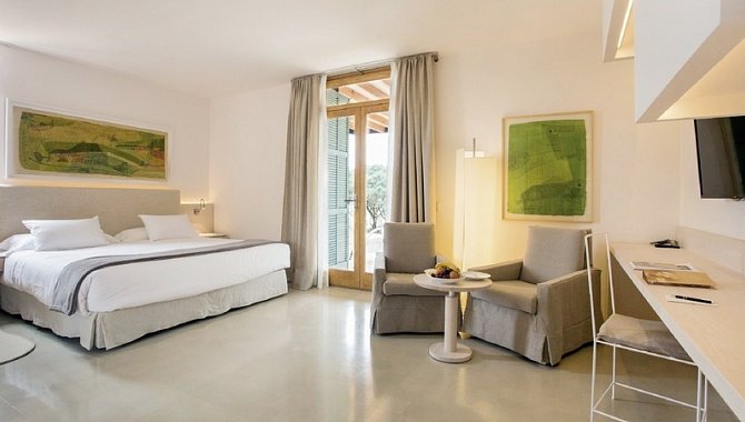 Luxury Suite with terrace (SUX3), Suite, Nichtraucherzimmer, Mindestalter im Zimmer: 18 Jahre, Landseite, Gartenblick, Landblick, Blick auf Natural Park of Es Trenc Salobrar, ca. 39 m², letzte Komplettrenovierung 2012, Gesamtanzahl der Räume in diesem Zimmertyp: 1, Aufteilung wie folgt: kombiniertes Wohn-/Schlafzimmer, Klimaanlage: zentral gesteuert, Heizung: zentral gesteuert, Fußboden: Teppichboden, Parkett, Safe, Sofa, Schreibtisch, Espressomaschine, Minibar: gegen Gebühr, Softdrinks: gegen Gebühr, Wasser: ohne Gebühr, alkoholische Getränke: gegen Gebühr, Snacks: gegen Gebühr, Minibarauffüllung: täglich, Telefon, Internet: WLAN/WiFi: ohne Gebühr, Fernseher: Flatscreen, im Wohnbereich, im Schlafzimmer, Roomservice: gegen Gebühr, Regendusche, WC, separates WC, Bademantel, Slipper, Föhn, Kosmetikspiegel, Balkon oder Terrasse: mit Whirlpool, mit Liegen